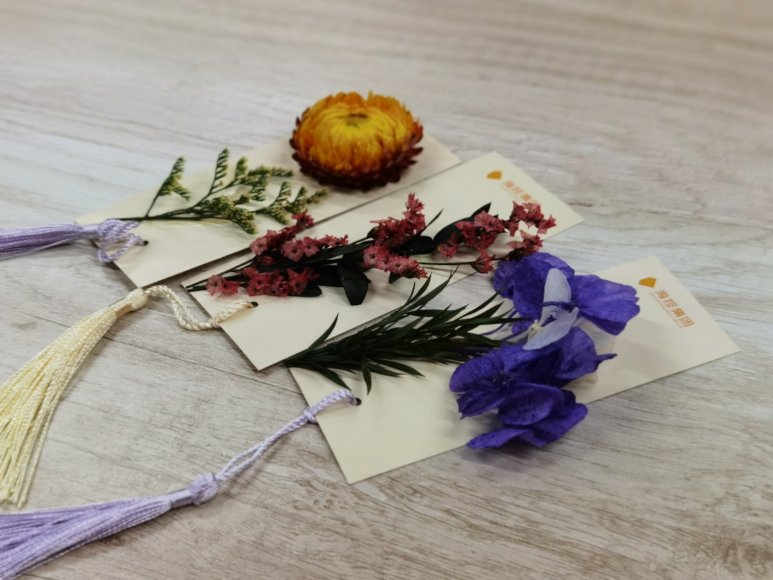 現(xiàn)場(chǎng)擺放有集團(tuán)定制logo書簽、空白書簽、干花和各色馬克筆。在學(xué)習(xí)小組和文藝小組的帶領(lǐng)下,大家用手中的畫筆和工具,在書簽上揮灑著創(chuàng)意與靈感。